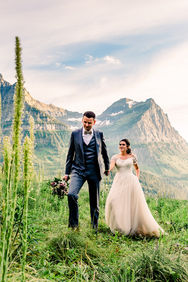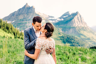 Wendy and Zach's Glacier Park wedding and adventure session were absolutely breathtaking! Glacier Park in summer is an outrageously magical place - hills of lushy emerald green, blue mountains majesty and rainbow sunsets that last forever. How lucky are we to be wedding photographers in such a wonderland! Wendy and Zach planned their entire Montana wedding from Switzerland and Seattle and it was BEAUTIFUL. We laughed all day from the moment a deer chilled with Wendy as she did her makeup outside in the morning to the hilarious sparkler exit that night near twilight. A few days after their wedding we went into Glacier Park for their sunset adventure session. Wendy's veil tried to kill her (and poor Sarah) on the bramble an absurd amount of times, but that sassy woman was a wildcat in those mountains, hiking up her dress to climb and run, running shorts and sneakers hidden under piles of tulle and lace. And run we did, all the way down to St. Mary's Lake at sunset, trying not to be eaten by bears in the dark. The road construction along Going to The Sun Road delayed our departure for HOURS. Have you ever been to Glacier at night? It's darker than dark, and brilliantly star spangled. One of our favorite experiences from that season was us sitting there, cliffside, in the utter blackness, eating endless snacks, telling jokes and getting a little punchy as we waited to escape the Park. That kind of stuff bonds people together for life and we will love Zach and Wendy always!